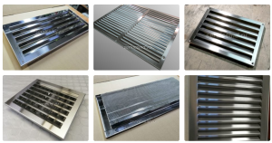 - Конструкция: Накладные решетки изготавливаются из цельного листа металла с несколькими рядами неподвижных жалюзи (ламелей), расположенных под фиксированным углом для эффективного распределения воздушного потока.