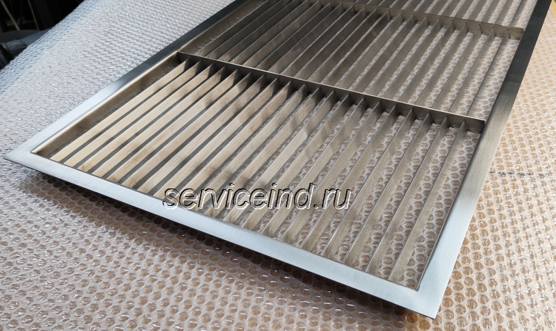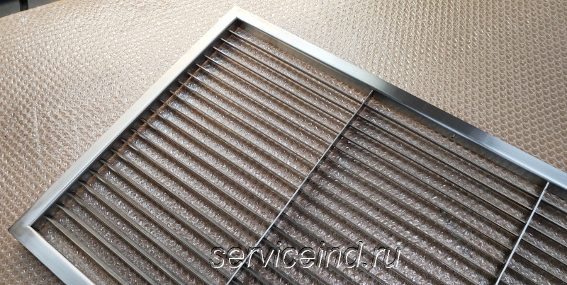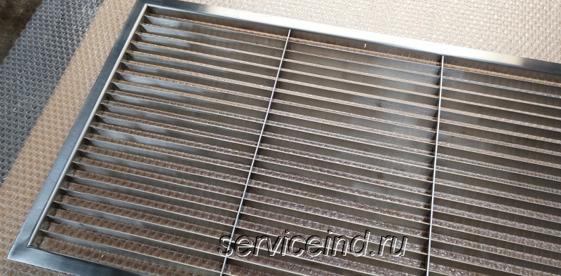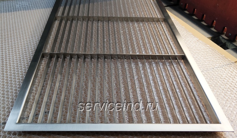 Решетки изготавливаются из нержавеющей стали 2мм, марки AISI 304 (08Х18Н10) При необходимости изготавливаются решетки из марки 430 или 316. Максимальная длина 2450мм, максимальная ширина 1200мм.